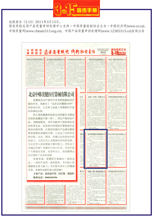 讓消費者質(zhì)量和服務(wù)同享,切實維護(hù)消費者的合法權(quán)益,提供權(quán)威可靠的質(zhì)量信息,共創(chuàng)放心的消費環(huán)境。美健通過了多方的官方考查,被認(rèn)定為醫(yī)療器械行業(yè)當(dāng)中最高質(zhì)量的產(chǎn)品且滿足顧客服務(wù)需求。